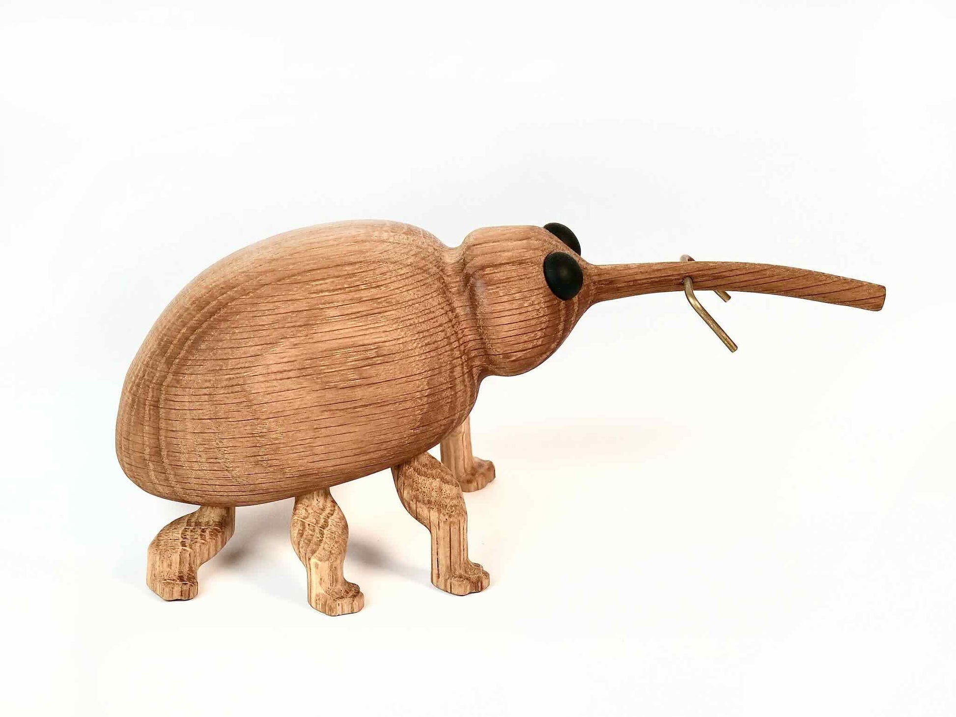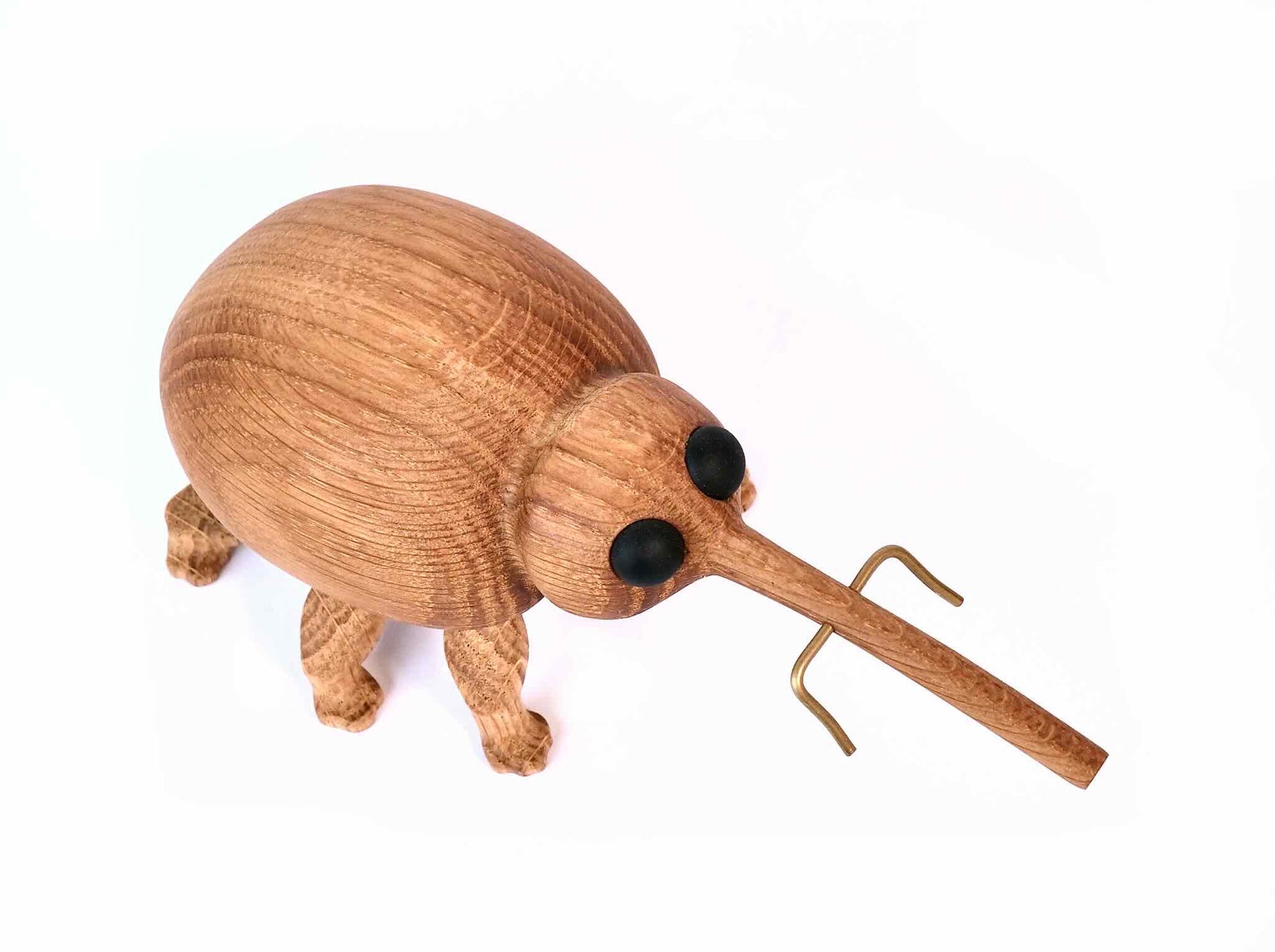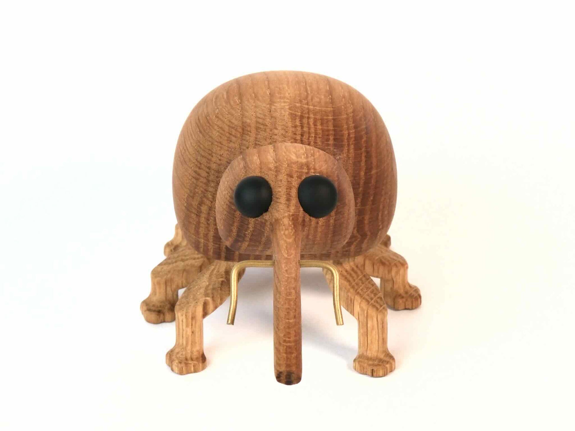 Kroppen og snablen på Anton er skåret ud af ét stykke lækkert egetræ, der sammen med benene er olieret med en bleget lindolie. Øjnene er i matteret sort glas og følehornene i messing. Jeg laver ikke ret mange, så hver eneste Anton er helt sin egen og bliver derfor nummereret på maven.