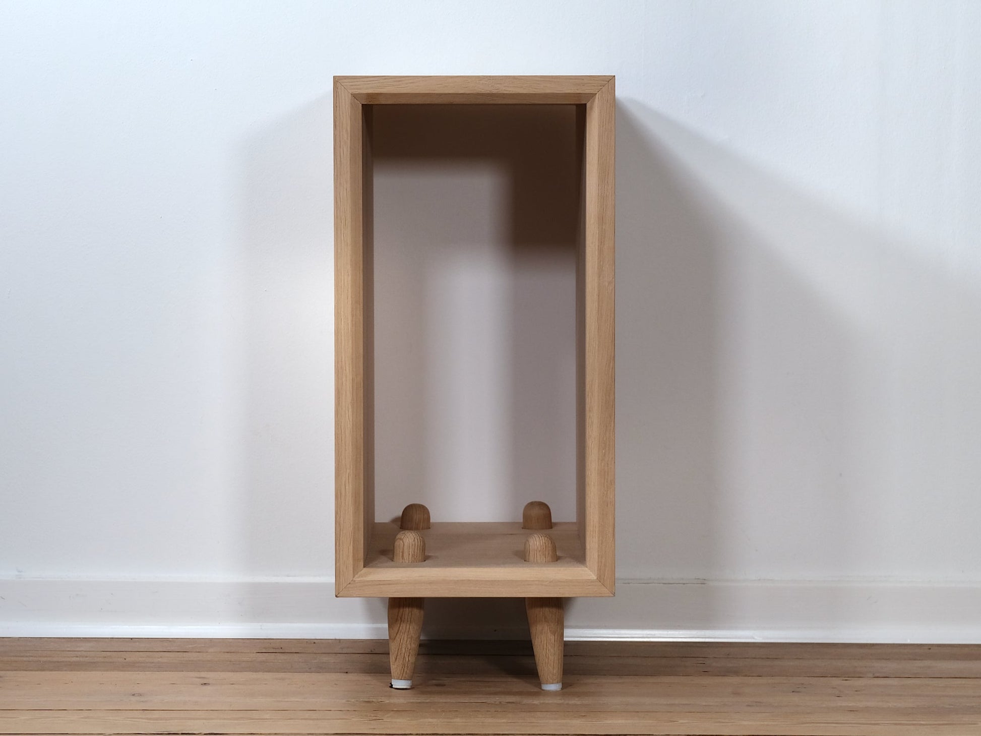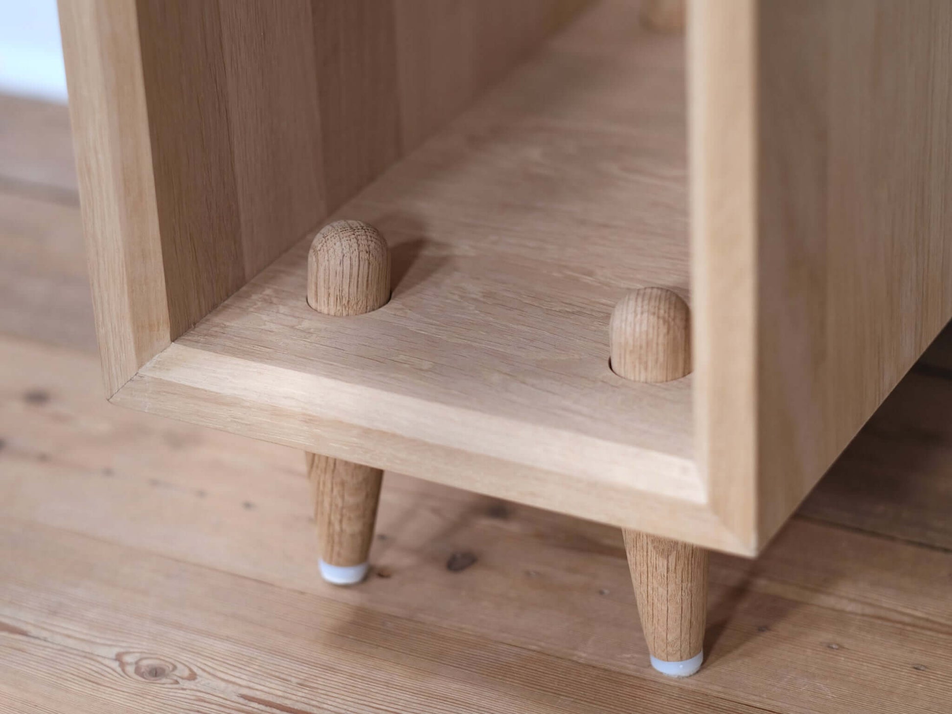Du får selv lov til at samle sidebordet – og det kan næsten ikke være lettere. De fire drejede ben sættes blot i hullerne i bordet, og drejes en smule, til friktion holder benene fast.